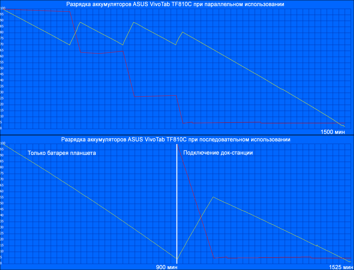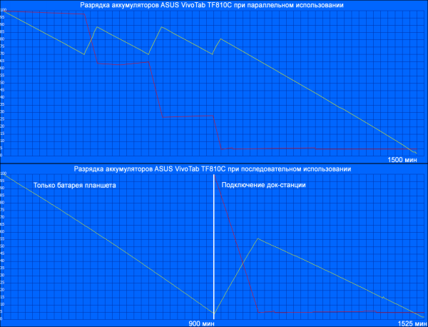 Обычно в Wintel-ноутбуках, оснащенных двумя аккумуляторами, батареи используются по очереди: вторая подключается, как только опустеет первая. Но в ASUS используют более экзотический вариант, разработанный для Android-линейки Transformer: дополнительная батарея док-станции используется как источник для зарядки основного аккумулятора.