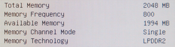| Оперативная память | 2 Гбайт, LPDDR2-800 (распаяна на корпусе процессора, нет разъемов расширения) |