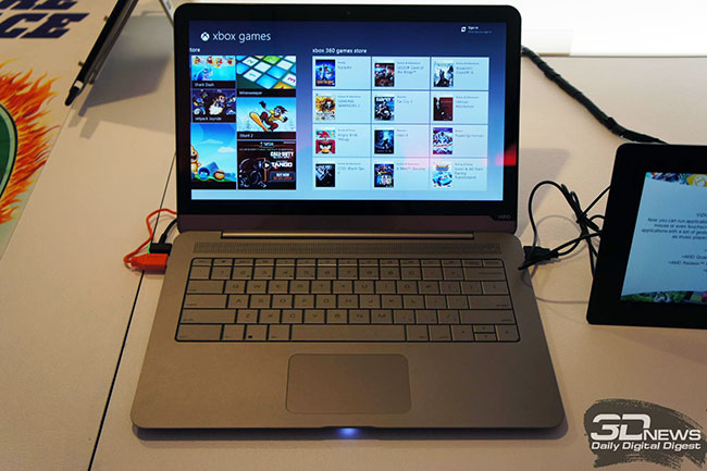 Третье представленное решение — ультратонкий ноутбук от американской компании Vizio, которая старается представить максимально широкий спектр устройств. Речь идёт о Vizio 14" Thin + Light. Он оснащается 14-дюймовым мультисенсорным экраном с разрешением 1600 x 900, 4-ядерным процессором AMD A10-4655M с графикой Radeon 7620G, 8 Гбайт оперативной памяти и работает под управлением Windows 8.