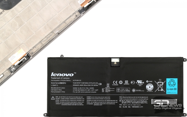 Как и большинство ультрабуков, Lenovo Yoga 13 оснащают несъемным аккумулятором, построенным на основе плоских элементов питания. Номинальная емкость достаточно высока: 54 Вт*ч.