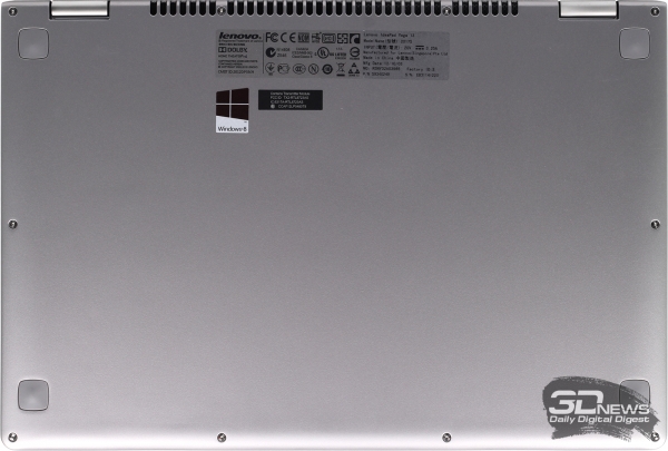 Кстати, днище полностью лишено вентиляционных отверстий — среди Windows-ноутбуков это редкость. Циркуляция воздуха осуществляется отчасти, как было указано выше, через клавиатуру, отчасти через заднюю грань корпуса: левая часть отверстий предназначена для «выхлопа», правая — для забора воздуха.