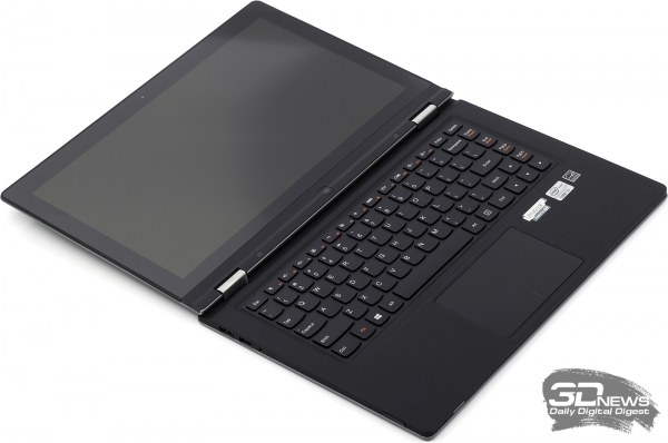 В данном случае мы имеем дело с IPS-матрицей производства LG, модель LP133WD2-SLB1. Диагональ экрана составляет 13,3 дюйма, с разрешением в Lenovo не стали перебарщивать — никакого Full HD, ограничились более пригодным для небольшого дисплея разрешением 1600x900 точек. Экран вместе с рамкой полностью закрыт прочным стеклом, весьма уместным в случае ноутбука, оснащенного сенсорным экраном.
