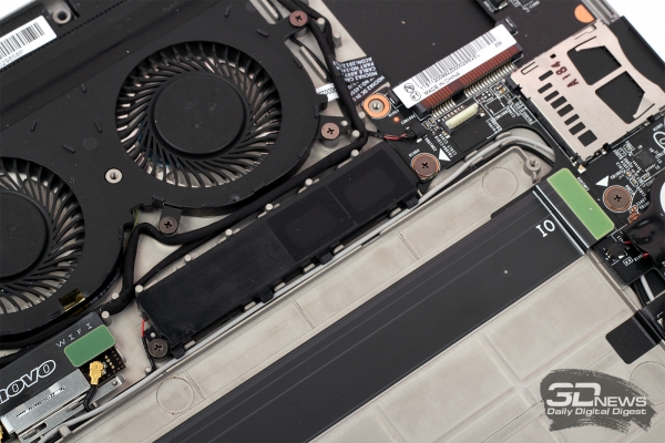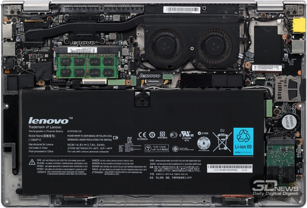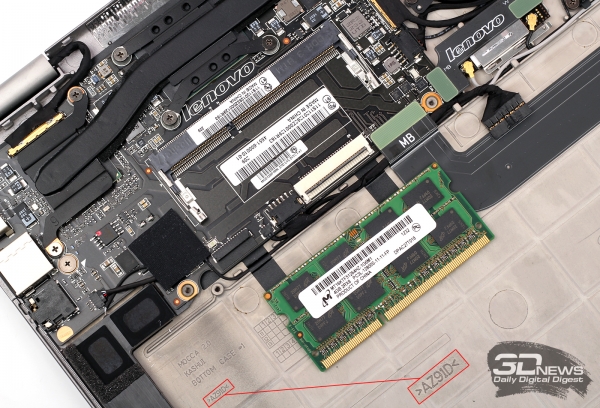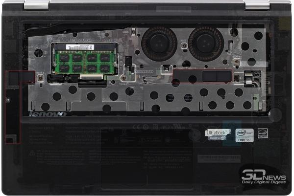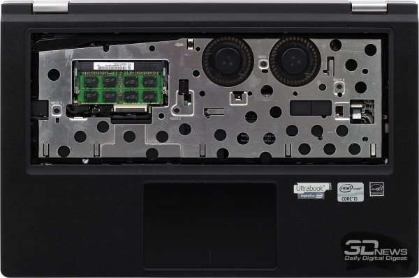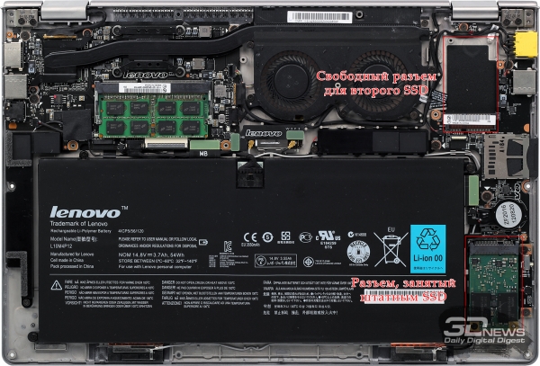 Вероятно, таким образом в компании готовились к созданию 3G-версии ноутбука — и освобождали второй слот Mini PCI (в первом установлен mSATA-накопитель). Однако 3G-версии Yoga 13 так и не появилось: в ноутбуке нет ни разъема для сим-карты, ни проводки антенн. Так что дополнительное место для мини-платы осталось свободным. В итоге его можно использовать под второй SSD. Прелесть в том, что нарастить объем дискового пространства можно без переноса системы.
