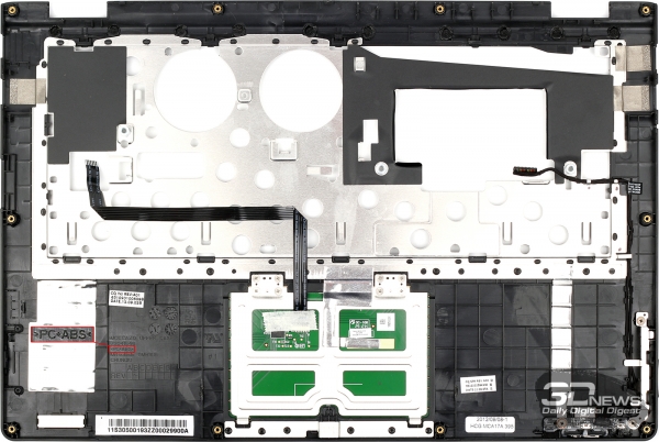 После удаления всех винтов, верхнюю часть корпуса несложно снять. Она полностью пластиковая — причем это самый простецкий пластик, стандартная смесь ABS+PC. Без добавления угле- или стекловолокна, без всего. Соответственно, деталь пришлось сделать довольно толстой, а поддон под клавиатурой склепали из дешевого металла — пластика тут было бы недостаточно. В итоге данная деталь корпуса получилась более увесистой, чем магниевая или алюминиевая.