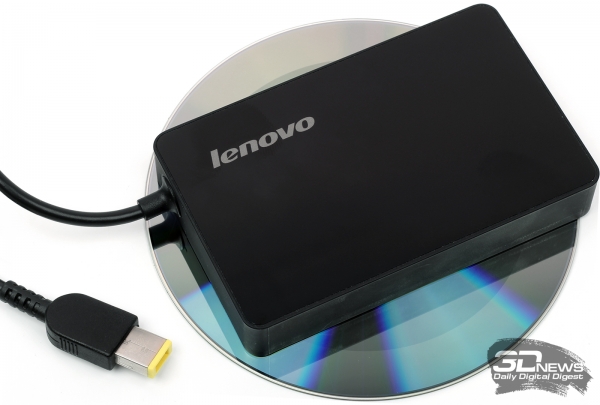 К нам на тест ноутбук попал с блоком питания, уже знакомым нам по предварительному обзору ThinkPad X1 Carbon. Это 65-ваттный адаптер, плоский и потому сравнительно компактный. Однако он предполагает использование тонкого двухжильного кабеля, поэтому в Европу — к который мы, увы, относимся — вероятно, не попадет. Финальная версия того же ThinkPad X1 Carbon оснащалась уже совсем другим блоком питания, видимо, так будет и в данном случае.