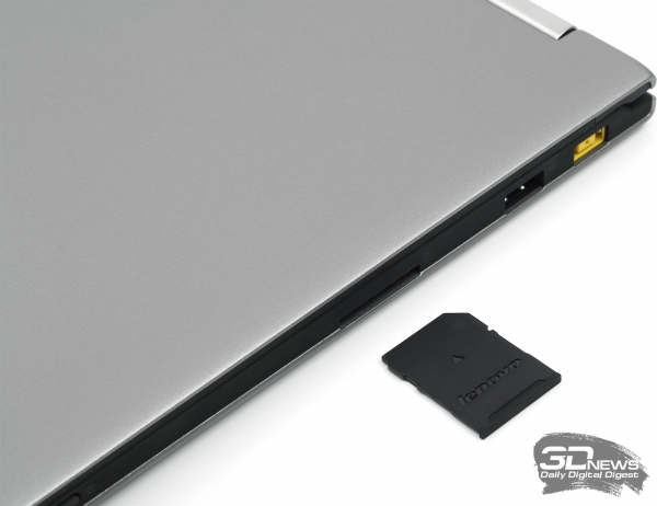 В итоге, несмотря на то, что внутренние ограничения по размещению портов в данном случае совсем не такие суровые, как в каком-нибудь MacBook Air, разъемов поместилось до обидного мало. Есть пара портов USB (почему-то лишь один из них поддерживает USB 3.0), единственный аудиоразъем, цифровой видеовыход и картовод. Хорошо, что разъем HDMI стандартный, а щель для карт памяти глубокая, полностью вмещающая карточку.