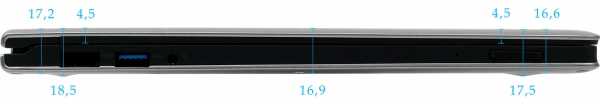 В официальных характеристиках IdeaPad Yoga 13 значится толщина корпуса 16,9 мм. Обычно производители забывают учесть дополнительный миллиметр от ножек, но в Lenovo пошли еще дальше: вместо толщины в самой «мясистой» части привели значение для середины корпуса. Однако корпус в сечении не прямоугольный — к задней части он немного расширяется. Так что реальная толщина составляет от 16,6 до 17,2 мм без учета ножек и от 17,5 до 18,5 — с учетом. Крышка имеет постоянную толщину на всем своем протяжении, 4,5 мм — весьма неплохо для сенсорного ноутбука.