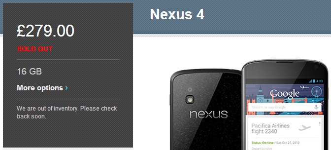 В английском магазине Google Play исчерпаны запасы планшетов и смартфонов Nexus. Хуже всего ситуация обстоит с Nexus 4: пользователям, заказавшим смартфон две недели назад, была обещана поставка в течение 3—5 дней, но до сих пор это не исполнено.
