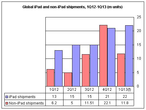 Впрочем, линейке iPad удастся добиться в первом квартале даже небольшого роста в 5%, увеличив поставки до 22 млн, таким образом, продукты Apple займут на рынке планшетов долю в 65,1%. Произведённые недавно обновления линейки в лице iPad 4 и iPad mini обеспечивают менее существенное влияние сезонных колебаний, которые в значительной степени отражаются на продажах планшетов от других производителей. Спад поставок последних будет находиться на уровне 46,9% по отношению к последней четверти прошлого года, а объём отгрузок этих устройств составит 11,8 млн единиц.