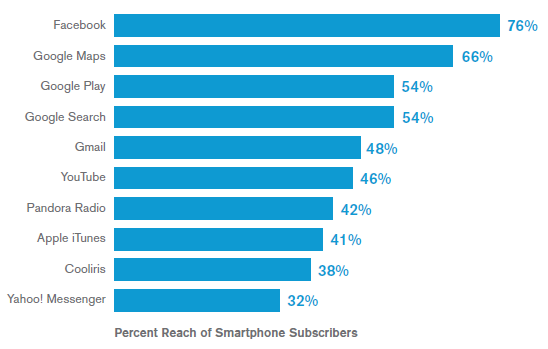 Самым популярным мобильным приложением в США остаётся Facebook — 76%. Клиент социальной сети опередил предыдущего лидера — приложение Google Maps.