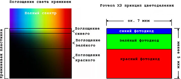 Технология в данном случае аналогична той, что применяет Sigma в своём сенсоре Foveon X3. Кстати, камеры Sigma DP1, DP2 и DP3 с таким сенсором производитель называет 46-Мп, хотя на практике разрешение матрицы — только 15,3 Мп. Зато технология позволяет добиться заметно более точной цветопередачи и повышенной детализации конечного изображения благодаря отсутствию необходимости в интерполяции.