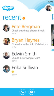 Перед разработчиками Skype для Windows Phone 8 стояла задача создать понятный и красивый интерфейс. При первом запуске приложения появляется список последних звонков и недавно завершённых диалогов. Здесь же можно открыть список контактов или избранных друзей.