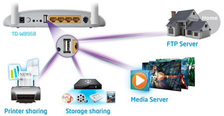 Благодаря наличию порта USB возможно подключение 3G-модема (только для устройства версии 2.0), принтера, медиабиблиотеки или накопителя для совместного доступа к файлам через Sаmba- или FTP-сервер.