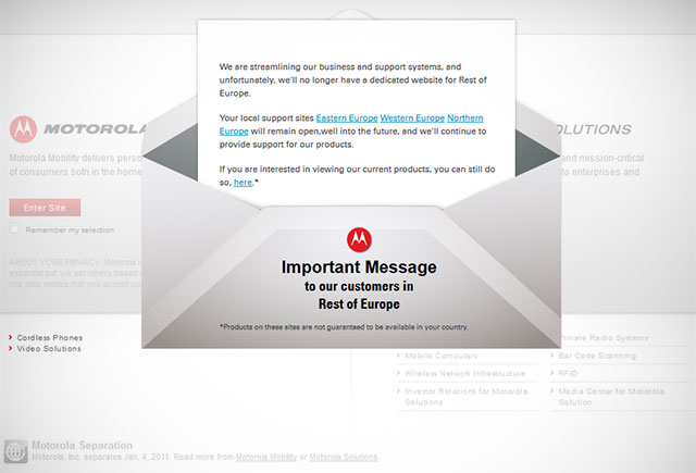 В качестве примера того, что происходит с сайтами Motorola, можно привести следующие региональные отделения: Азия, Европа, Ближний Восток и Африка, Гонконг и Тайвань. При попытке зайти на эти ресурсы американская компания вежливо отказывает, сообщая, что теперь у неё нет специальных сайтов для этих регионов, и делается это с целью оптимизировать бизнес и систему поддержки.