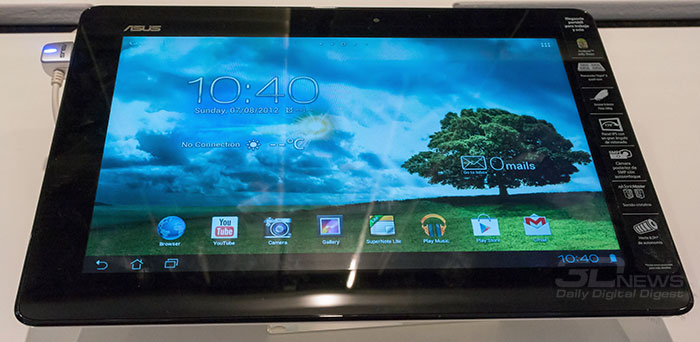 Рядом с этим аппаратом можно было встретить планшет ASUS VivoTab Smart, работающий под управлением полноценной версии операционной системы Windows 8 благодаря однокристальной системе Intel Atom Z2760 с двумя ядрами x86 с тактовой частотой 1,8 ГГц. Аппарат получит 2 Гбайт оперативной памяти и 64 Гбайт постоянной флеш-памяти (также на 3 года ASUS предоставляет 32 Гбайт облачного хранилища данных).
