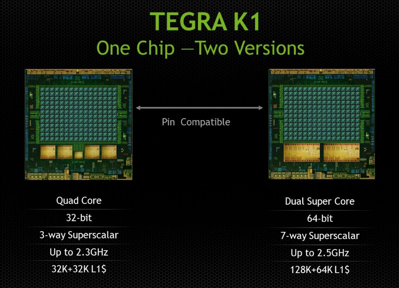 Планшет Nexus 9, который готовит к выпуску компания HTC и который должен будет заменить собой стремительно устаревающий Nexus 7, представляет собой очень интересное устройство. В первую очередь потому, что, по слухам, он будет использовать не обычную версию чипа NVIDIA Tegra K1 c четырьмя ядрами Cortex A15, а существенно более мощный 64-битный вариант под кодовым названием «Denver». Эта версия Tegra K1 имеет всего два процессорных ядра, но они существенно мощнее обычных и построены на базе суперскалярной архитектуры с семистадийным конвейером против трёхстадийного у классического варианта K1. Существенно увеличен и объём всех кешей.