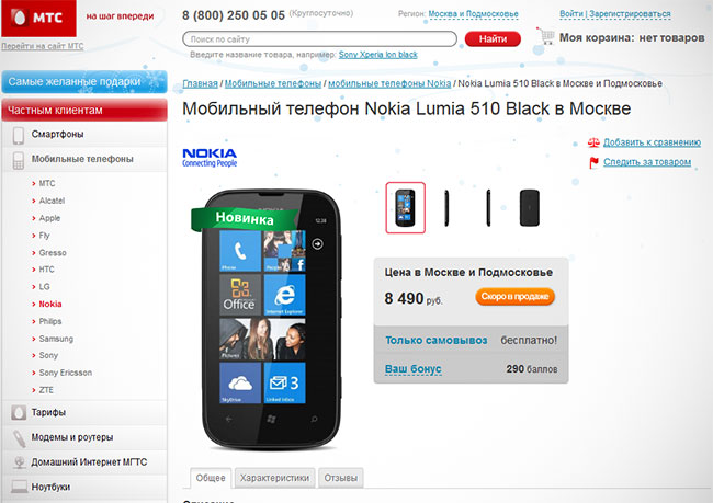 Nokia Lumia 510 появилась на сайте МТС