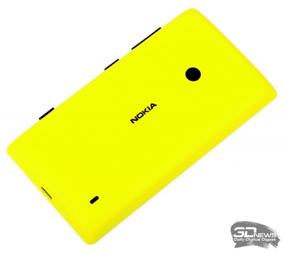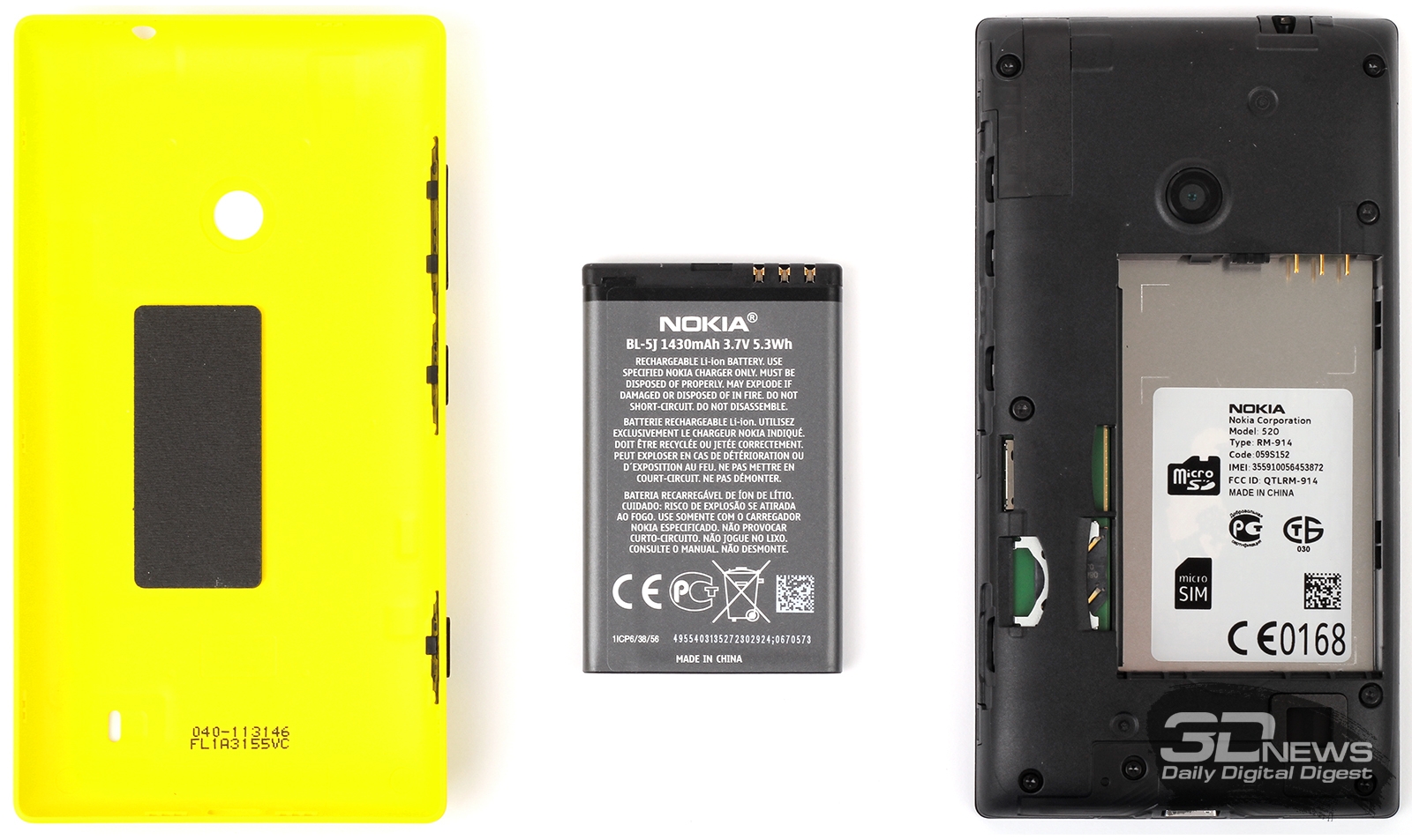 В Lumia 520 задняя панель съемная. Крепится она исключительно на защелках, причем не слишком тугих, потому что предполагает доступ пользователя «под капот», так что неизбежный люфт имеет место. Металлического каркаса внутри корпуса нет, поэтому прогибается и проминается аппарат сравнительно легко.