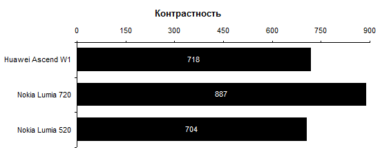 Помимо невысокой яркости у дисплея бюджетной «Люмии» есть еще масса недостатков: воздушная прослойка между сенсорным стеклом и ЖК-матрицей, отсутствие поляризационных фильтров (в терминологии Nokia — ClearBlack) и посредственные углы обзора. Поэтому, хотя сферическая контрастность в вакууме, которая может быть измерена нашим прибором, у дисплеев 520-й и 720-й различается не так уж сильно, на практике разница в глубине черного кардинальная.