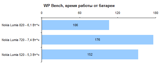 И это действительно так: в стресс-тесте аккумулятора WP Bench 720-я работает, конечно, не в полтора раза дольше 520-й — но по крайней мере на лишние 15-20% свободы от розетки рассчитывать можно совершенно твердо. По сравнению с «почти флагманской» Lumia 820, которая способна продержаться в этом тесте менее двух часов, результаты весьма достойные. При средней интенсивности использования и с Lumia 520, и с Lumia 720 есть хорошие шансы дотянуть до конца рабочего дня.