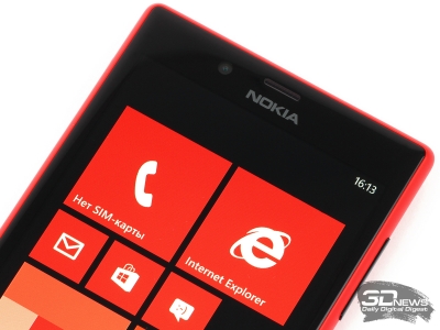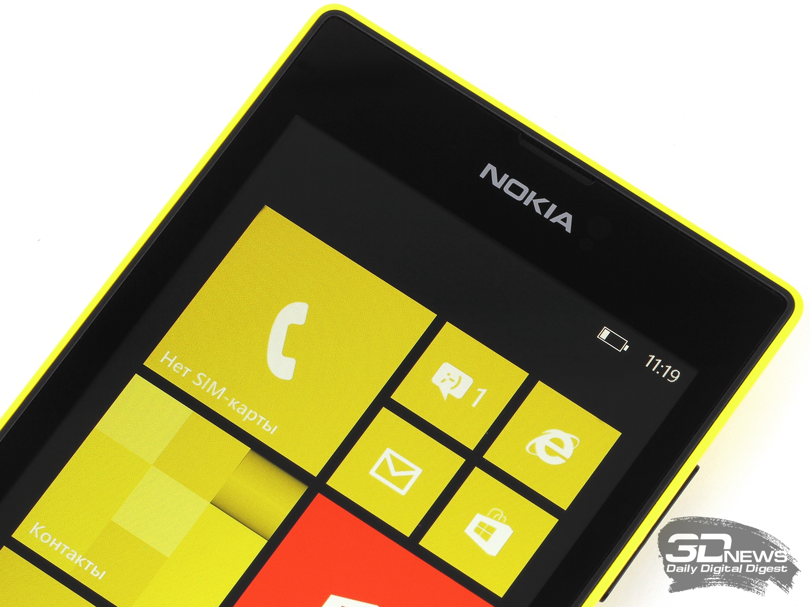 Что касается передней стороны, то и здесь все совсем по-разному. В старшей модели использовано стекло Gorilla Glass 2 с фирменным, чисто «нокиевским» мягким закруглением краев и олеофобным покрытием. В 520-й «стекляшка» более прозаическая, плоская. И что самое печальное — без олеофобного покрытия. Буквально за полчаса общения с телефоном поверхность покрывается толстым слоем отпечатков — после этого палец скользит по ней «вязко». Ощущения при этом не самые приятные: практически как от оконного стекла.
