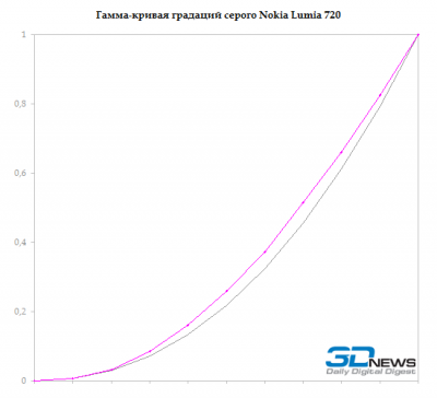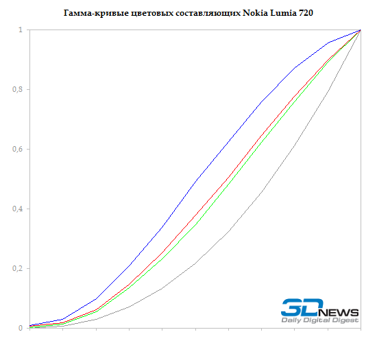 Гамма-кривые — еще один повод для недоумения. Дисплей Nokia Lumia 520 оказался настроен на удивление аккуратно: легкая перенасыщенность цветовых составляющих в правой части графика — по меркам мобильных устройств совершенно несущественная небрежность.