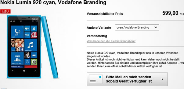 Однако затем американский оператор AT&T представил эксклюзивно своим подписчикам вариант Lumia 920 голубого цвета. Похоже, эксклюзивность вскоре закончится. По крайней мере, немецкий розничный магазин предлагает голубую версию того же аппарата под маркой оператора Vodafone. Стоимость этого устройства составляет 600 евро. Интересно, что чёрный, белый, жёлтый и красный варианты в том же магазине стоят чуть дороже — 650 евро.