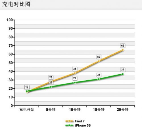 Как рассказали эксперты, по прошествии 20 минут уровень заряда аккумулятора OPPO Find 7a составил 65%, а смартфон iPhone 5s мог похвастаться лишь 37%. Таким образом, китайский флагман заряжается практически вдвое быстрее американского, говорят в MyDrivers. Тем не менее, при достижении уровня в 75% скорость зарядки у OPPO Find 7 снизилась до обычного показателя. Насколько быстро в итоге батарея аппарата достигла значения в 100%, не уточняется.