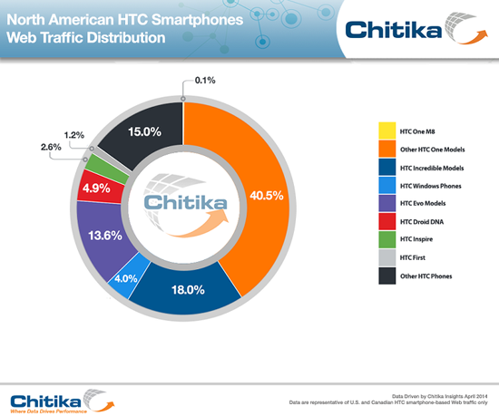 В целом на все смартфоны тайваньской компании в США и Канаде приходится 8,4% мобильного веб-трафика от всех Android-устройств в этих странах. Это позволяет HTC занимать третье место, однако от первой строчки корпорацию отделяет пропасть: лидирует Samsung с показателем 61,7%.