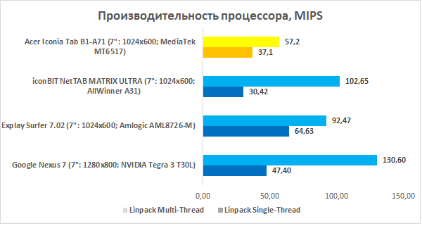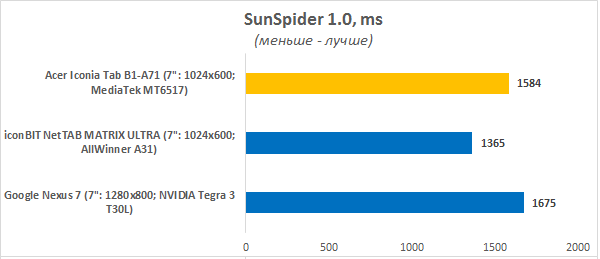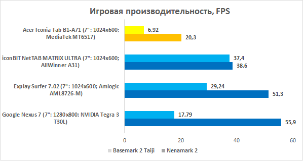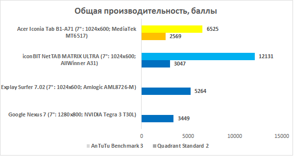 Возможностей процессора вполне хватает для гладкой работы операционной системы. Анимация, переключение между окнами и приложениями — всё это происходит очень плавно. Несложные приложения запускаются без проблем, а вот программы потяжелее начинают подтормаживать — и это вполне ожидаемо. В синтетическом задании Quadrant 2 новинке не хватило полутысячи баллов до iconBIT NetTAB MATRIX ULTRA, работающего на четырехъядерном процессоре AllWinner A31, так что уровень производительности для ультрабюджетного планшета у Iconia B1 вполне достойный. Требовать большего от Acer, вероятно, наглость.