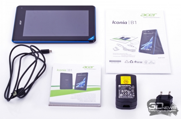 Комплект поставки у Acer Iconia B1 ожидаемо скромный. Никаких аксессуаров вроде наушников или чехла он в себя не включает. В коробке мы обнаружили следующее: