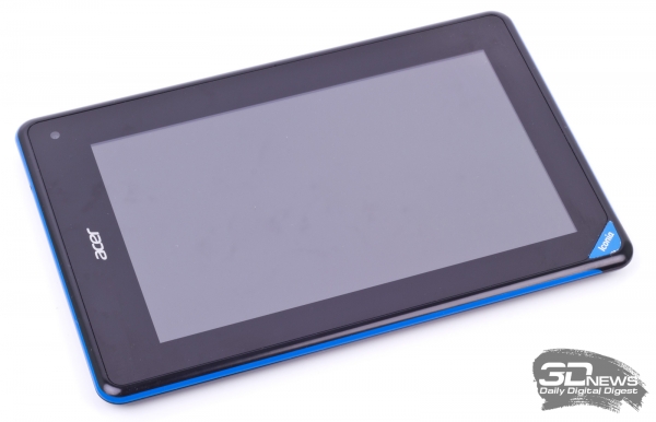 В планшет установлен семидюймовый экран, основанный на технологии TN. Матрицы такого типа в портативных гаджетах последнее время встречаются, к счастью, нечасто, однако совсем из употребления они еще не вышли. Основной недостаток всех TN-дисплеев и данного в частности — очень узкие углы обзора. При отклонении взгляда от перпендикуляра цвета инвертируются, информация на экране становится нечитаемой. Устройство приходится держать строго перед лицом, минимальное смещение уже вызывает искажение цветовой гаммы — смотреть фильм вдвоем на дисплее Iconia B1, например, неудобно. Впрочем, вероятно, на этом месте обзора стоит еще раз вспомнить стоимость новинки. Разрешение экрана — 1024x600 точек — наименьшее из использующихся. Результирующая плотность пикселей — 169,5 на дюйм. Показатель небольшой — мелкий текст, например подписи к иконкам, выглядит несколько смазанно, да и «лесенку» из пикселей разглядеть совсем несложно. Дисплей крайне живо и в большинстве случаев точно реагирует на прикосновения — количество ошибок минимально. Экран без проблем распознает жесты и поддерживает до пяти одновременных касаний.