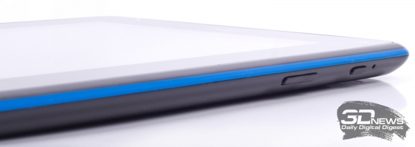 Отличительная черта новинки — синий кант, проходящий по всем боковым сторонам корпуса. Вроде мелочь, но из-за неё планшет смотрится очень интересно и необычно. Яркие элементы вроде этого — то, чего не хватает рынку Android-гаджетов в целом. Элементов управления или разъемов у новинки минимум. Кнопка включения и клавиши регулировки громкости находятся на верхнем торце. Интерфейс microUSB и слот для карточки памяти microSD, скрывающийся за пластиковой заглушкой, — на правой грани, а 3,5-мм разъем для подключения наушников или проводной гарнитуры — на левой.