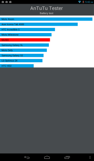 В Acer Iconia B1 установлен несъемный аккумулятор на 2710 мА*ч (10 Вт*ч, 3,7 В). Для планшетного ПК это совсем небольшая ёмкость — даже в некоторых смартфонах-переростках встречается более вместительная батарея. В синтетическом тесте AnTuTu Battery Test модель показала ожидаемо средний результат, разрядившись с 100% до 19% за 3 часа 41 минуту и получив за это 469 баллов.