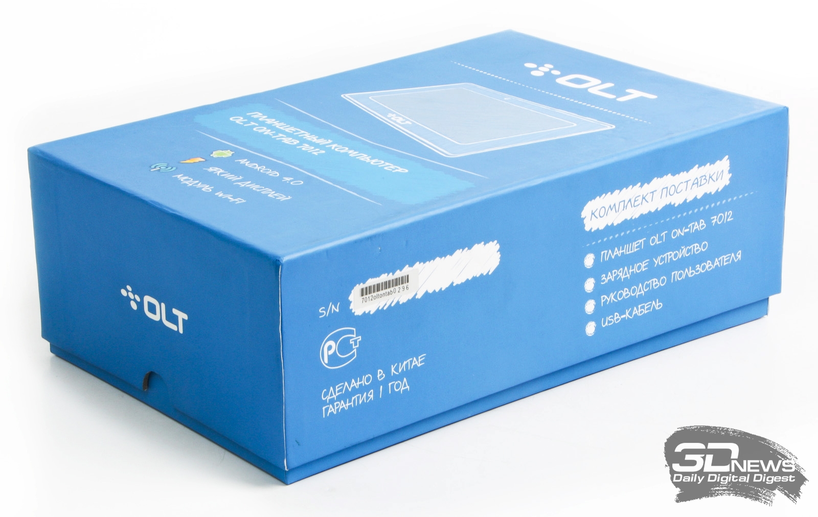 Планшет упакован в довольно большую ярко-синюю коробку из плотного картона, на лицевой стороне которой находится логотип OLT и схематичное изображение новинки, стилизованное под карандашный рисунок. Здесь же перечислены основные, по мнению производителя, плюсы устройства: Android 4.0, яркий дисплей, модуль Wi-Fi. То есть планшет рассчитан на нетребовательного пользователя, которому не нужны GPS, 3G, мощный процессор и прочие «плюшки». На задней стороне коробки схематично показано расположение всех интерфейсов и элементов управления. На всех торцах продублированы логотипы компании-дистрибьютора и перечислено содержимое комплекта поставки.