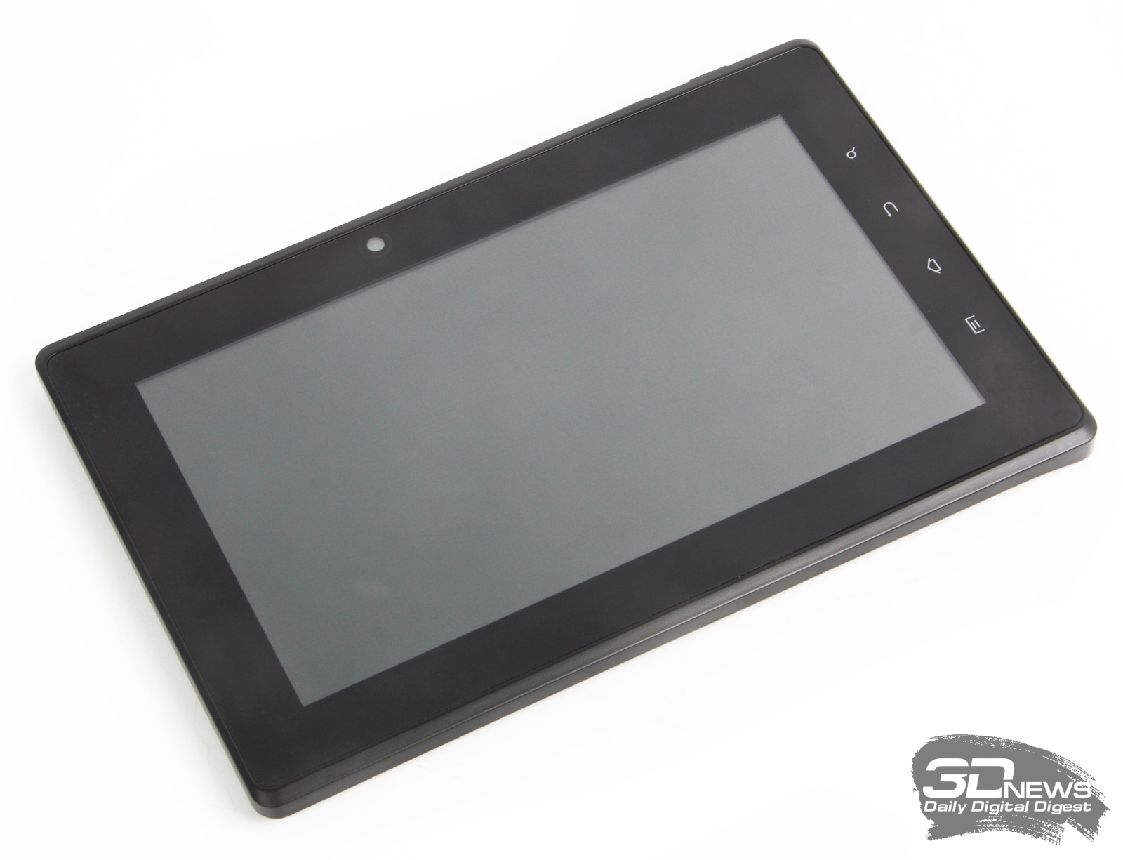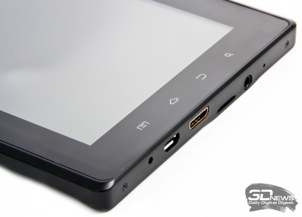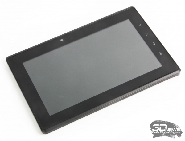 Внешность новинки типична для семидюймового планшета, однако одна особенность у нее все-таки есть. На лицевой панели расположены сенсорные клавиши «Настройки», «Домой», «Назад» и «Поиск», от которых мы отвыкли со времен Android версии 2.3. В верхней части рамки расположен глазок 0,3-Мп камеры. Дисплей планшета прикрыт стеклом, которое защищает его от повреждений. Это, разумеется, хорошо, но неплохо было бы приложить сверху еще одну «защиту», которая спасет первую от мелких царапин и отпечатков пальцев, которые собираются с большой охотой.