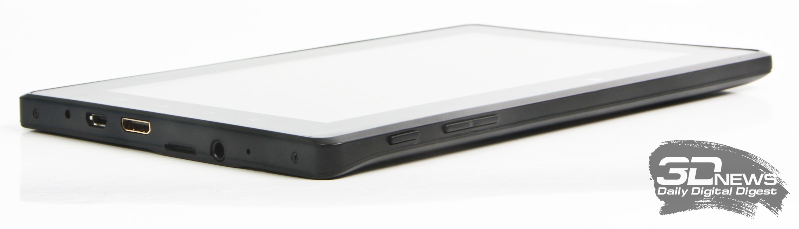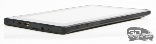 Аппаратные клавиши управления планшетом (кнопка включения/блокировки и качеля регулировки громкости) расположены на верхней грани устройства. Все заявленные в спецификациях интерфейсы прячутся на правом торце планшета. Здесь находятся (слева направо): разъем для подключения к зарядному устройству, интерфейс microUSB, видеовыход mini HDMI, слот для карточек памяти microSD, 3,5-мм аудиовыход и чувствительная зона микрофона. Расположение элементов стандартное, поэтому тот, кто держал в руках Android-планшет хотя бы раз, быстро привыкнет к новинке от OLT.