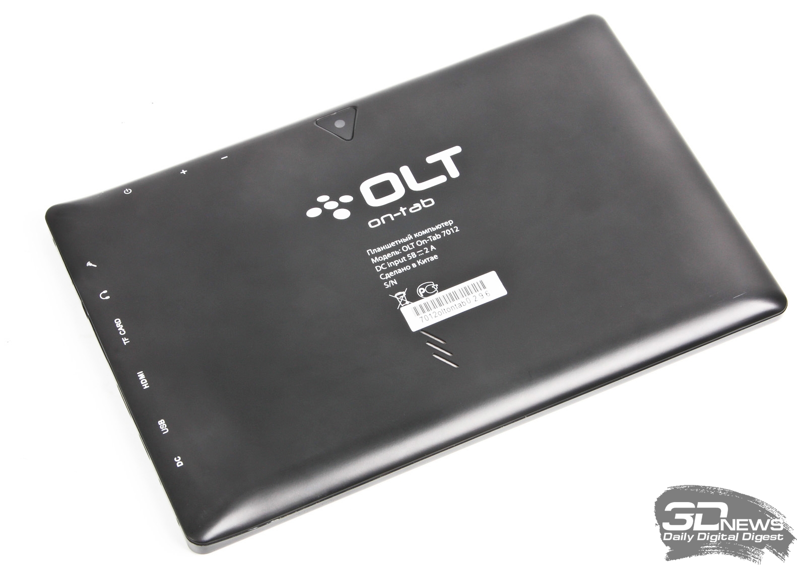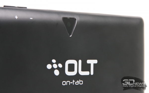 Задняя панель устройства матовая, однако крайне маркая. Стоит достать планшет из коробки, как поверхность покрывается следами от пальцев, а избавиться от них порой бывает непросто. Вверху расположена 2,0-Мп камера, под ней — логотип OLT и техническая информация, а снизу находится прорезь небольшого динамика. На задней панели подписаны все клавиши и разъемы, находящиеся сбоку, чтобы начинающим пользователям было комфортнее работать с планшетом.