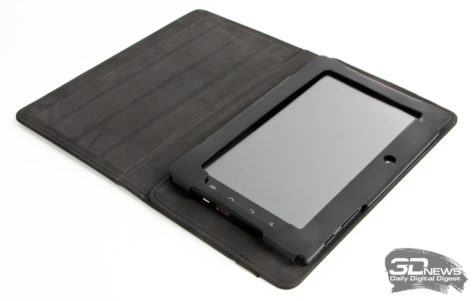 Идущий в комплекте с планшетом чехол из кожзаменителя вполне практичный, но он ощутимо увеличивает габариты устройства