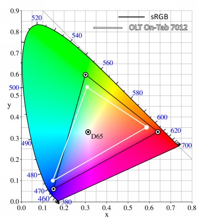 Цветовой охват дисплея OLTT On-Tab 7012 в сравнении с цветовой палитрой sRGB; палитра дисплея — белый треугольник; палитра sRGB — черный треугольник
