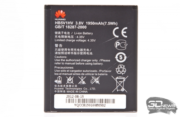 Смартфон работает от литий-полимерного аккумулятора на 1950 мА*ч (7,5 Вт*ч, 3,8 В). Для устройства подобного класса это вполне стандартная ёмкость, которой в теории должно хватать на день работы при умеренных нагрузках.