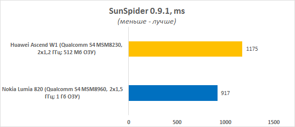 Новинка еще раз наглядно продемонстрировала, что обновленный мобильный Internet Explorer в паре с хорошим, но отнюдь не топовым процессором творит чудеса. В кроссплатформенном тесте SunSpider 0.9.1 смартфон показал завидный для многих Android-смартфонов результат — 1175 мс. Отображение страниц в стандартном браузере происходит очень быстро и гладко. Бродить по Сети — одно удовольствие. Устройство без затруднений отображает тяжелые веб-странички и декодирует потоковое видео. В целом Huawei Ascend W1, благодаря сочетанию удачного двухъядерного процессора и наполированной до блеска «восьмёрки», получился очень быстрым смартфоном.