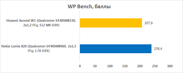 В синтетическом тесте WP Bench новинка показала очень даже неплохой результат — 207,6 балла. Для того чтобы сравняться с более дорогой Nokia Lumia 820, ей не хватило чуть более тридцати очков — это мелочи. В распоряжении Huawei Ascend W1 находятся 512 Мбайт оперативной памяти и четыре гигабайта встроенной (из которой, правда, более трех занимает операционной система), расширяемой при помощи карточек памяти microSD объемом до 32 Гбайт. В общем, техническая начинка в устройстве вполне годная. В процессе повседневной работы смартфон плавно отображает анимацию операционной системы, гладко переключается между окнами и совсем не тормозит, что пусть и ожидаемо, но весьма приятно.