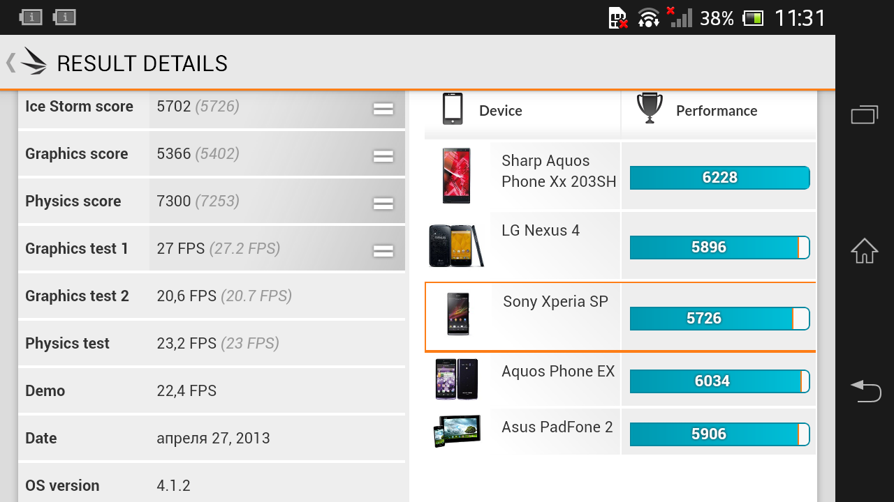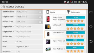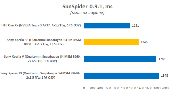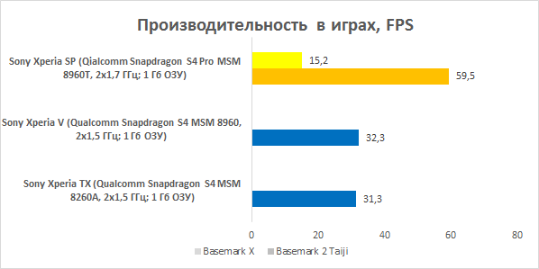 Отличие чипа QS S4 Pro MSM8960T от Plus MSM8960 заключается в использовании более производительного графического контроллера — Adreno 320 (вместо Adreno 225), который в паре с двумя мощными ядрами Krait выдает впечатляющую мощность. Разумеется, устройство без проблем воспроизводит видео в формате высокой четкости Full HD. Вполне вероятно, что смартфон осилит и Ultra HD 4k со скоростью 48 или 60 кадров/с, если на то будет необходимость. Владельцам Xperia SP доступны самые тяжёлые игрушки — гаджет уверенно справляется с ними. Об этом свидетельствуют отличные результаты в мобильной версии бенчмарка 3DMark. В тесте Basemark 2 Taiji типичным результатом для смартфонов средней ценовой категории является 25-35 FPS, однако новинка показала в нем 59,5 FPS! Простенькое задание Nenamark 2 после такого результата запускать было бессмысленно.