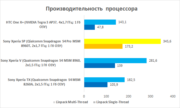 Вычислительный тест Linpack наглядно показал, что даже не самый мощный чип Qualcomm может дать сто очков вперед монструозной версии Tegra 3 — AP37 (в которой, напомним, четыре ядра Cortex A9!). Чип NVIDIA примерно в два с половиной раза отстает от своего двухъядерного конкурента. Также на графике видно, как с каждым новым смартфоном Xperia шаг за шагом вырастает и производительность устройств. В мультипоточном задании новинка набрала более 345 MIPS — отличный результат.