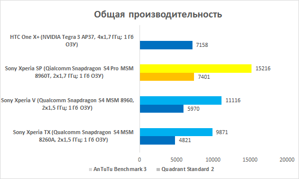 В общих синтетических тестах рекордных результатов устройство не продемонстрировало. Однако более пятнадцати тысяч «попугаев» в AnTuTu Benchmark и чуть менее семи с половиной в Quadrant — результат очень и очень достойный. В последнем задании устройство чуть опередило HTC One X+, работающий на уже упомянутой четырехъядерной «Тегре», что говорит об очень приличном запасе мощности. В процессе повседневной работы Sony Xperia SP очень плавно отрисовывает анимацию операционной системы, без проблем держит открытыми несколько ресурсоёмких приложений и шустро переключается между ними. А уж про мультимедийные задачи вообще говорить не приходится.