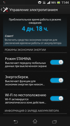 В новинке, как и в других смартфонах Sony, есть специальный режим STAMINA, отключающий передачу данных через Wi-Fi и мобильные сети в «спящем» режиме. Разумеется, присутствует и стандартный режим экономии энергии, деактивирующий большинство энергозатратных модулей при достижении аккумулятором определенного процента заряда. Также в смартфоне предусмотрен режим включения Wi-Fi по местоположению — при нахождении рядом со «знакомыми» сетями. При грамотной настройке всех указанных выше параметров заряда аккумулятора хватает более чем на сутки умеренной нагрузки.