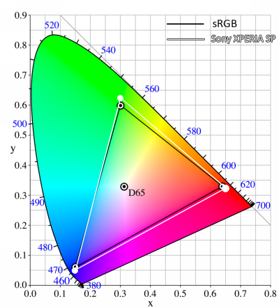 Sony Xperia SP — цветовой охват экрана (белый треугольник) в сравнении с цветовым пространством sRGB (черный треугольник)