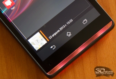 Расположение элементов управления у Xperia SP вполне типичное для Android-смартфона. Металлическую кнопку включения устройства на правом торце корпуса не мешало бы сдвинуть чуть выше, чтобы большому пальцу не приходилось тянуться до неё. Здесь же находится качелька регулировки громкости и клавиша активации камеры.