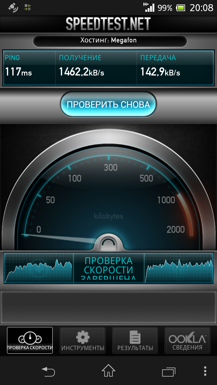 Система-на-чипе Qualcomm Snapdragon S4 Pro MSM8960T обладает встроенным модемом с поддержкой сетей второго, третьего и четвертого поколений. Но самое главное то, что новинка теоретически умеет работать в сетях LTE на российских частотах. Помимо этого, передача данных при LTE-соединении может вестись параллельно с голосовыми вызовами в сетях 2G/3G. К сожалению, увидеть LTE в действии у нас не получилось. Мы вставили SIM-карту одного из операторов «большой тройки», который вроде как предоставляет доступ в мобильный Интернет через сети четвертого поколения, ходили-бродили по всей Москве в поисках треклятого LTE и… не нашли. Xperia SP в режиме LTE Only так ни разу и не подключился к сети. Очевидно, новый стандарт сетей нашим операторам только предстоит осваивать. Зато в режиме 3G+ (HSDPA с теоретическим пределом 21 Мбит/с) устройство развило скорость почти 15 Мбит/с на прием, что очень хорошо. Следует учитывать, что быстрота передачи данных зависит от покрытия и нагрузки сети. Голосовые вызовы с помощью Sony Xperia SP совершать удобно — у разговорного динамика приличный запас громкости, да и собеседники за время тестирования аппарата не жаловались на то, что нас им плохо слышно.